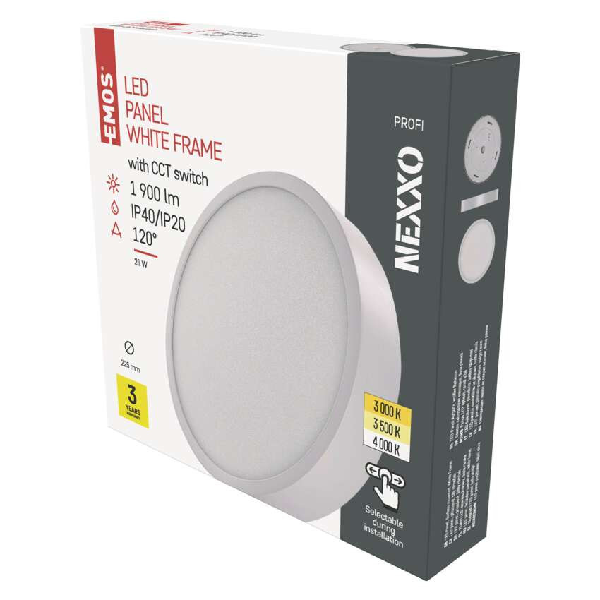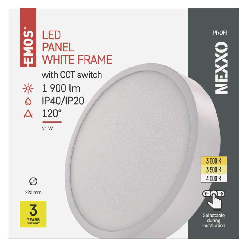 fényforrás: LED, fogyasztás: 21 W, helyettesítő: 120 W, védettség: IP40/IP20, fényáram: 1 900 lm, színhőmérséklet: 3 000/3 500/4 000 K, fény színe: meleg fehér-semleges fehér, forma: kör, lámpatest: acéllemez, a diffúzor anyaga: műanyag (PMMA), diffúzor típusa: tejfehér, színvisszaadási index (CRI): Ra > 80, sugárzási szög: 120°, összeszerelés módja: csatolt, méretek: 225 × 42 mm átmérővel, keret színe: fehér, frekvencia: 50/60 Hz, feszültség: 220–240 V, áramerősség: 500 mA, kategória: PROFI, sorozat: NEXXO, garancia-időszak: 3 év, értékesítési csomagolás: 1 db, doboz, élettartam: 30 000 óra, teljesítménytényező: > 0,9, fényhasznosítás: 90 lm/W, LGP anyag: PMMA, flicker-free, áramforrás kimeneti áramerősség: nincs megadva